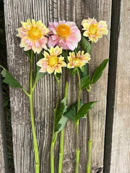 Such a happy looking dahlia that brightens up every arrangement! Cut when pedals just start to open for perfect blooms and the longest vase life. Insects love this collarette dahlia, so cutting early helps keep blooms bug free as well.