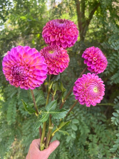 Ball dahlia with 4-6 inch blooms. The color is stunning, with shades of watermelon, raspberry, rose, pink, lavender and plum.