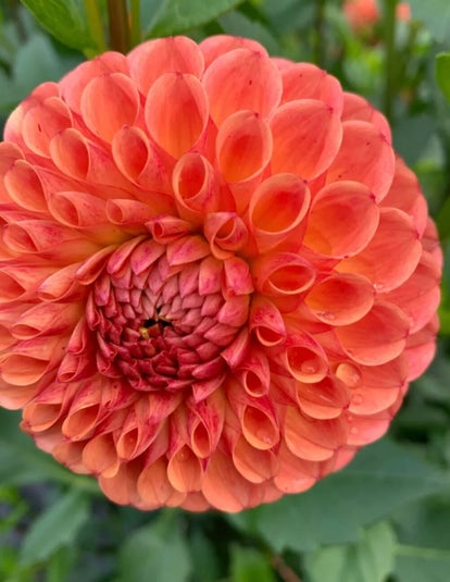 Bloooms in this stunning ball dahlia vary in color, from sherbert orange, buttercream, raspberry and peach. No two blooms are ever the same! Size is about 3 1/2 -4 inches.